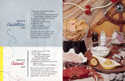 We've already covered the desserts for the big day this week, now it's time for the other important food stuff-- and no, I don't mean the turkey and taters-- I mean the MF'in dips!!! If you've stumbled upon this blog and aren't hip to dips, well today's your lucky day cuz we've got 17 extraordinary ways to flavorfully enhance those chips, shrimps, celery sticks, and Hell, maybe some of you will be dipping your toes into it-- mmm mmm, it's all good! I'm pretty much set on anything that includes Worcestershire sauce in the ingredients, and since that's nearly every recipe here, it's gonna be a tough decision to make cuz OMG they all look amazing! Also amazing here is the fun lay-out of this mid century Philadelphia Cream Cheese booklet itself, (did anyone else know they've been around since 1880??!!) --with cheery little party illustrations and temp-tasty photography that really makes me what to get started on the dip-appetizers NOW!!! Which one will you choose?