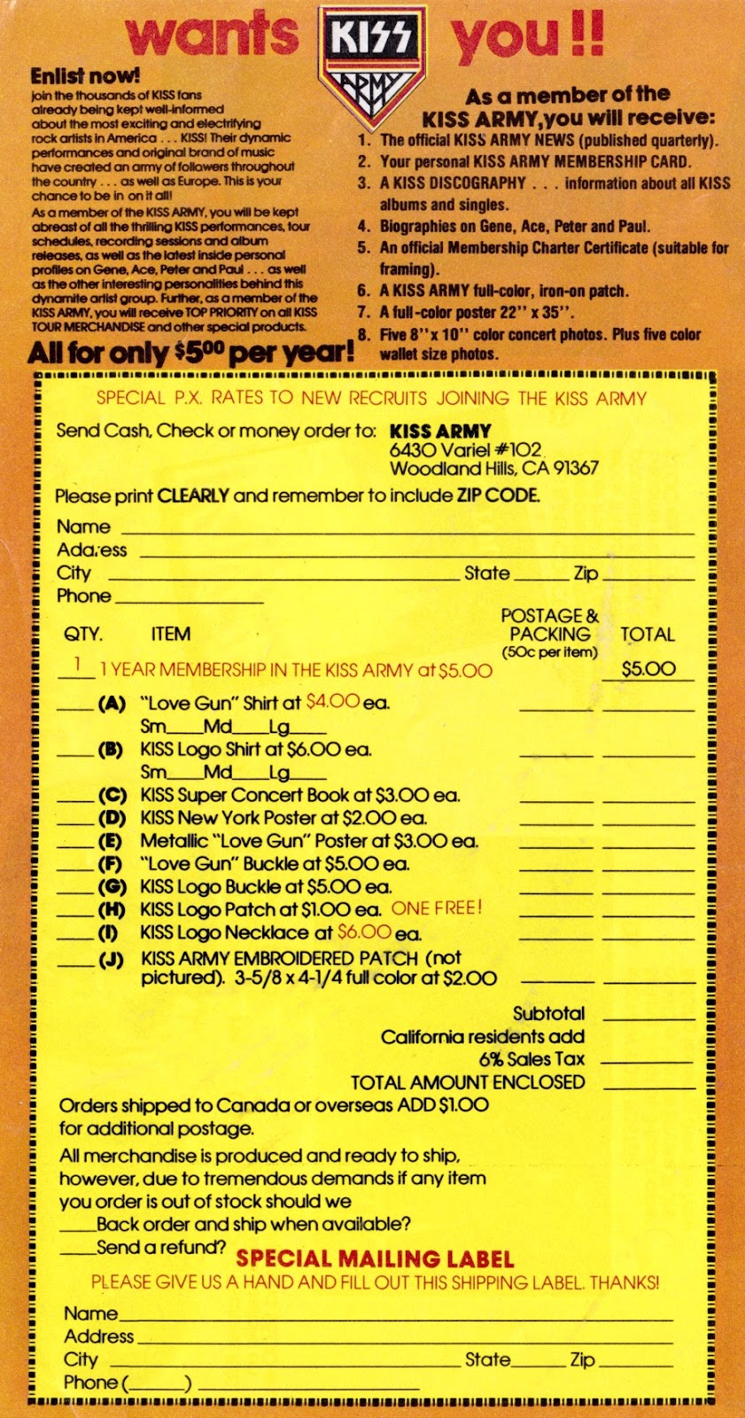Another cool 70's album insert order form, this time from the hottest band in the land-- KISS! Lots of Love Gun related greatness, (I still have the logo belt buckle G, as well as the logo necklace I), plus another reminder to join the KISS Army if for some reason you still hadn't by 1977. The backside of the form also reveals an ad for the amazing, 40-page, Marvel Comics Super KISS Special that actually had blood from all 4 members of the band mixed into the printing ink! All of this stuff totally rocked my 9 year old world back in the day, --it was such a great time era to be a KISS fan-- and I finally got to see them live a few years later in '79! My very first rock concert!