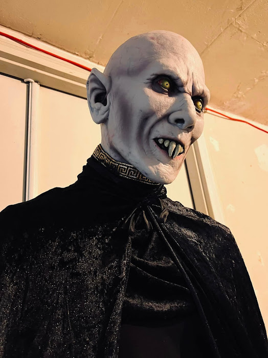 That's right, PT. 2... did you miss PT. 1? Just CLICK HERE for it. So okay, picking up where we left off in the previous post: I had the amazing Death Studios "Vampyre" Mr. Barlow display mask and hands, as well as the velvet cape / decorative collar piece that I fashioned out of an old halloween costume-- now I just needed to dig out some of my own tight black clothing: shirt, pants, socks (it's actually kind of funny to think about a monster like Mr. Barlow putting on socks for the evening), and then wrap all of it around a sturdy, standing framework. Lucky for me, --though unlucky for Macy's department store-- a local mall here has closed down, and most of the MIA stores there have been selling off their display fixtures and fashion mannequins for dirt cheap. Thankfully when I got there, they still had one very tall male mannequin, minus the head, and complete with metal supportive stand. Dressing the mannequin took mere minutes, as I'm sure by now, most of you already know I collect vintage mannequins and do dress application daily. Adding the final touch of monster mask and the ghastly, livid hands and HOLY OMG MOLY he looked perfectly terrifying, --even scaring all of the bugs out my work garage in seconds! The cape was of course too short, but I wanted to wait until I got him inside to extend it to the floor anyway, to avoid getting it dirty from the garage that I never sweep. You'll have to scroll all the way to the end of this post for a few of the long cape indoor pix.