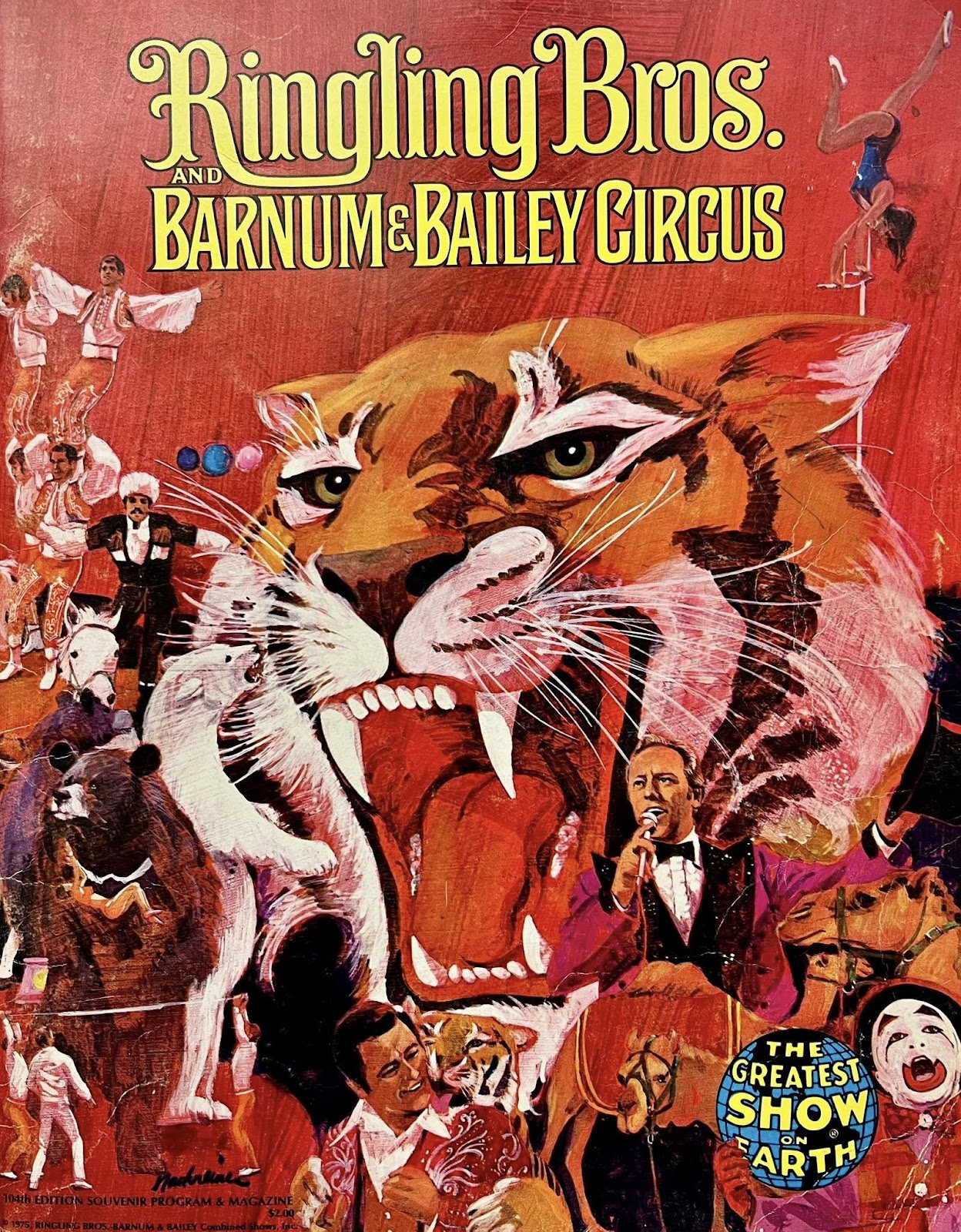 Cleaning out some old books and mags and stuff, I stumbled upon a handful of circus programs I've collected over the years, ranging from the 1970's and up to 2016. The first thing I noticed, comparatively speaking, when looking at them back to back was simply how much more fun the old ones are than the newer ones (which I actually tossed in the garbage.) I was going to even post examples, but then decided I didn't want to stink up my blog with bad design, crap photography, and even worse-- just piss poor, modern style anti-graphic design. Instead, I'll just focus on a couple things I love about 70's Ringling Brothers circus programs: bright, colorful, fully painted wraparound covers, cutely illustrated pages within containing games and puzzles for kids, wonderfully designed candy ads, and just how clever and adorable the puppets and blow-up souveniers were too! I was equally reminded how wonderfully weird and wild the circus could be as well --anyone remember Gargantua, or Poland's Monastyruk!