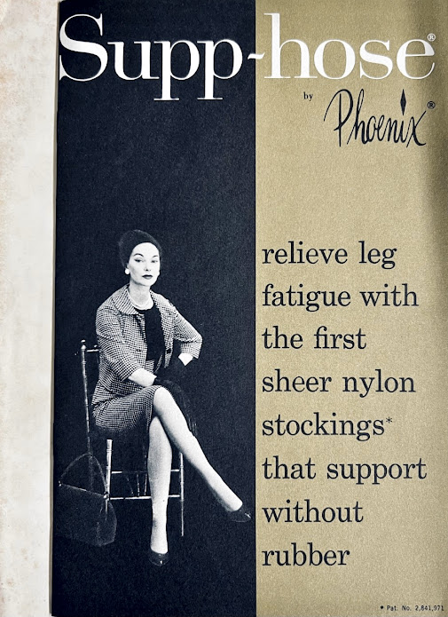 I love great packaging and logo design, and one fine example I recently found is this unused, vintage box of Supp-Hose Phoenix nylon stockings, circa 50's. From the gold-trimmed, colorful box lid and lovely leggy photography, to the superbly streamlined tissue wrap and booklet inside, (complete with fun mid century illustrations to boot!) --it certainly doesn't get much more classy than this! What'supp, hose?
